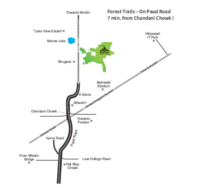 Forest Trails — a 170-acre integrated township — is a serene sanctuary where nature and modern living exist in perfect harmony. Home to a rich variety of flora, fauna, and birds, it offers a tranquil escape nestled in the lap of nature, yet close to the city. Located in Bhugaon, Forest Trails lets you enjoy peaceful surroundings without compromising on urban conveniences. Spread across 90% open green spaces, it features scenic walkways, landscaped expanses, and The Cliff — an exclusive lifestyle club offering a host of delightful experiences. Every corner invites you to unwind, explore, and rediscover bliss amid nature’s calm. Set near the serene Manas Lake and framed by the majestic Sahyadri hills, Forest Trails enjoys a rare blend of natural beauty and strategic location. Just ahead of Kothrud and Bavdhan, and only 13 km from Pune City Centre, it offers seamless connectivity. With infrastructure developments like the new bypass, Chandni Chowk Cloverleaf Flyover, proposed Ring Road, and upcoming Metro station, residents enjoy effortless access to Hinjawadi, Pirangut, and major intercity highways — making Forest Trails both a peaceful retreat and a smart investment.